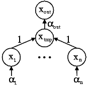 wie Programm (5.41) umgeformt werden, so daß die Forderung 5.3.1 erfüllt ist. Die Gewichte mit dem festen Wert 1, die dadurch im neuronalen Netz entstehen, dürfen nicht verändert werden, damit nach dem Training alle optimierten Gewichte als Wahrheitswerte interpretiert werden können. Dies bedeutet eine leichte Modifikation des Algorithmus für das Training. Es können wie bei der ursprünglichen Version für alle Neuronen Gewichtsänderungen berechnet werden, jedoch werden diese Änderungen bei entsprechend gekennzeichneten Neuronen nicht ausgeführt. Wenn ein Programm aus mehr als einer Regel besteht, können mehrere Regeln die