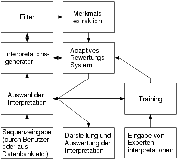 7.3. Aufbau des SystemsDer Aufbau des ISSM besteht aus mehreren Modulen, deren Zusammenwirken in Abbildung 7.4 schematisch gezeigt wird. Die Daten bestehen aus Sequenzen und für das Training aus Experteninterpretationen. Im Anwendungsfall wird eine Interpretation berechnet, die dem Benutzer präsentiert werden kann, während das Training aufgrund der Sequenzen und Experteninterpretationen die Parameter des Systems verändert. Die Auswahl beginnt mit der Generierung der Interpretationen. Hier werden alle Interpretationen erzeugt, die innerhalb der gegebenen Bedingungen für eine Eingabe und ggf. Vorgabe zulässig sind. Der Interpretationsgenerator ist eng mit den Filtern für perzeptuelle Plausibilität verbunden. Sie werden auf mehreren Stufen der Generierung eingesetzt, um die Anzahl der Bewertungen zu verringern. Die erzeugten Interpretationen werden durch ein adaptives System bewertet, wobei verschiedene Modelle möglich sind. Als Eingabe des Bewertungssystems dienen die Merkmale, die aus der Interpretation extrahiert werden. Das Auswahlmodul steuert die Generierung der Interpretationen und wählt die Interpretation aus, die die beste Bewertung erreicht. Diese Interpretation mit den berechneten Merkmalen wird im Anwendungsmodus als Ausgabe des Systems dem |