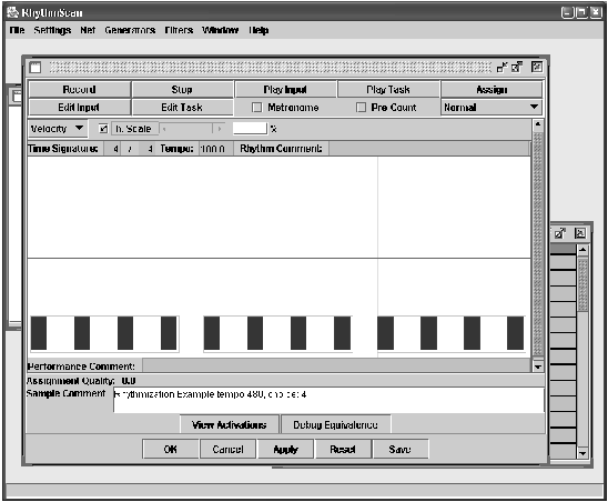 Die Versuchspersonen waren zwischen 30 und 38 Jahren alt und hatten unterschiedliche musikalische Ausbildungen. Diese Stichprobe ist weder repräsentativ noch groß genug, um irgendwelche generell gültigen Ergebnisse zu liefern. Es ging aber nicht darum, subjektive Rhythmisierung im allgemeinen zu untersuchen, sonder Daten musikalischen Verhaltens zu sammeln. An diesen Daten sollte getestet werden, ob das ISSM aus Beispielen lernen und generalisieren kann. Die Ergebnisse zeigen eine Einheitlichkeit, die in dieser Ausprägung vermutlich |