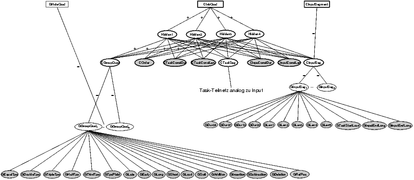 Struktur des Multi-Layer-Perceptrons MLP4. Die Gewichte der Verbindungen, die mit ’+’ gekennzeichnet sind, können nicht negativ werden.
