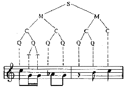 Grammatiken sind in der Rhythmik vor allem für die Beschreibung der metrischen Struktur von Rhythmen benutzt worden. Hier ist insbesondere die Grammatik von Longuet-Higgins und Lee zu nennen, die eine der ersten Anwendungen dieser Art war.44 Sie beschreibt auf jeder Ebene metrischer Dauer die Unterteilungen in zwei oder drei Noten durch Regeln. Ein Ableitungsbaum nach dieser Grammatik stellt die metrische Struktur eines Rhythmus dar, wie in Abbildung 4.1 an einem Beispiel gezeigt wird. Unter der Voraussetzung der Unabhängigkeit von Metrik und Motivstruktur unterstützt ein solches System die rhythmisch-motivische Analyse nicht, insbesondere nicht bei Ausführungsdaten, die keine metrische Information enthalten.