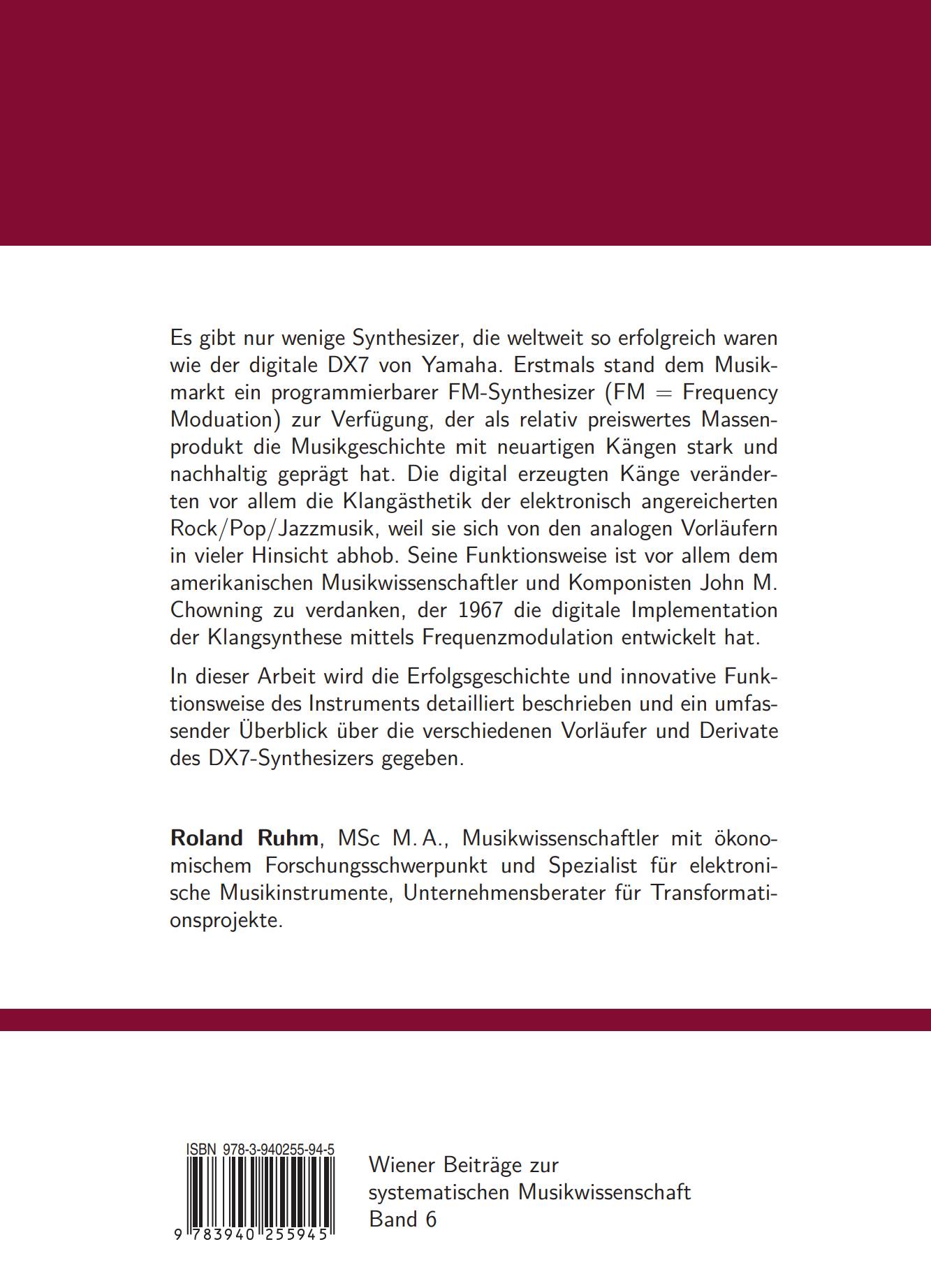 | | |  | Ruhm, RolandGeschichte und Einfluss des Yamaha DX7 epOs-Music, 212 Seiten, über 100 farbige Abbildungen, dazu zahlr. Grafiken und Tabellen, umfangreiche Quellenangaben Bd. 6 in der Reihe "Wiener Beiträge zur systematischen Musikwissenschaft", hrsg. v. Christoph Reuter