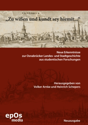 | | |  | Arnke, Volker / Schepers, Heinrich (Hrsg.)„Zu wißen und kundt sey hiemit...“Neue Erkenntnisse zur Osnabrücker Landes- und Stadtgeschichte aus studentischen Forschungen epOs-media, Neuausgabe, 335 Seiten, zahlreiche S/W-Photographien, Tabellen, Quellenangaben Erstveröffentlichung in der Reihe: Osnabrücker Geschichtsquellen und Forschungen, herausgegeben vom Verein für Geschichte und Landeskunde von Osnabrück (Osnabrück: Selbstverlag des Vereins, 2014), finanziert aus Studienbeiträgen Osnabrück 2016ISBN 978-3-940255-68-6 (CD-ROM) | |